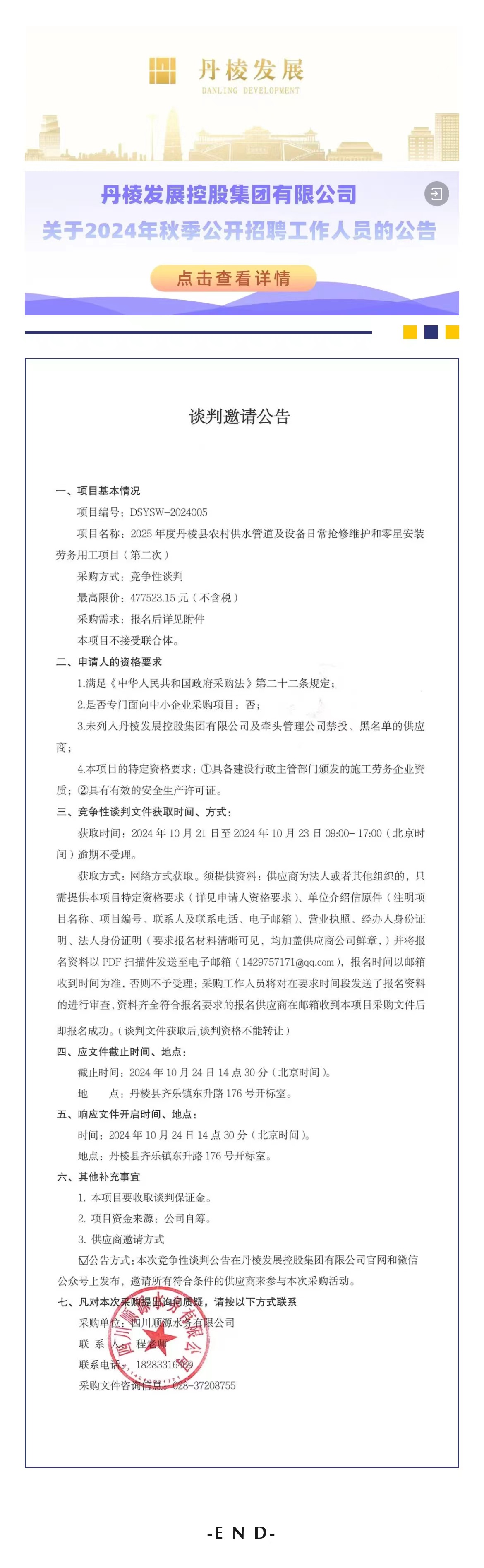 2025年度丹棱縣農(nóng)村供水管道及設(shè)備日常搶修維護和零星安裝勞務(wù)用工項目第二次談判邀請公告