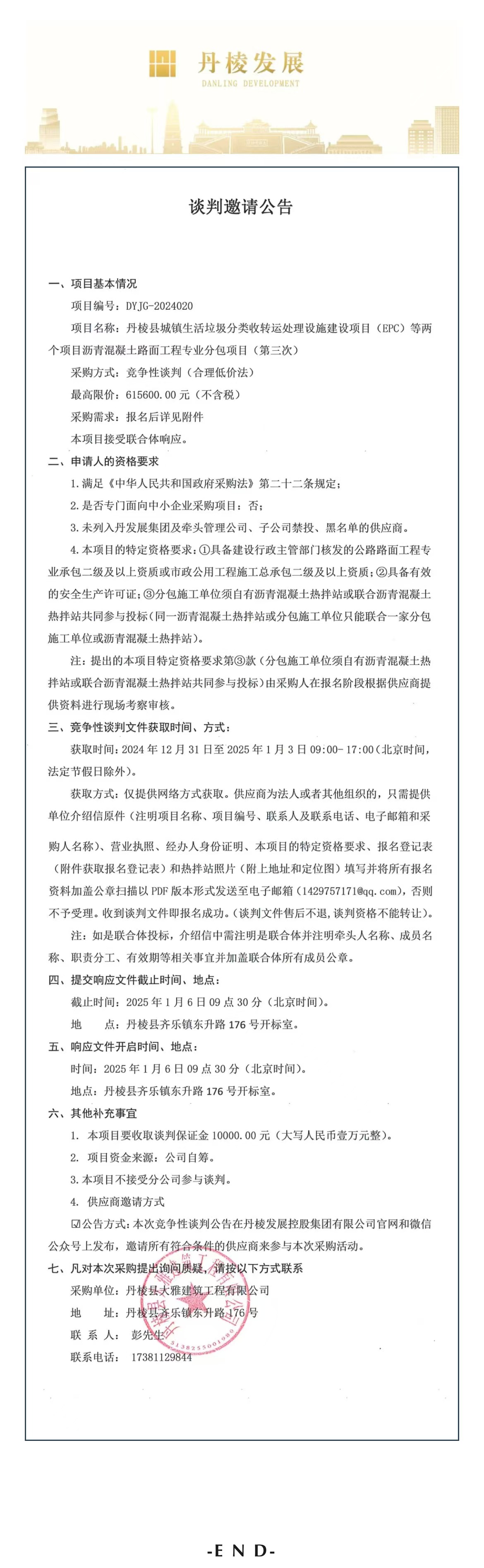 丹棱縣城鎮(zhèn)生活垃圾分類收轉(zhuǎn)運處理設(shè)施建設(shè)項目(EPC)等兩個項目瀝青混凝土路面工程專業(yè)分包項目(第三次)談判邀請公告