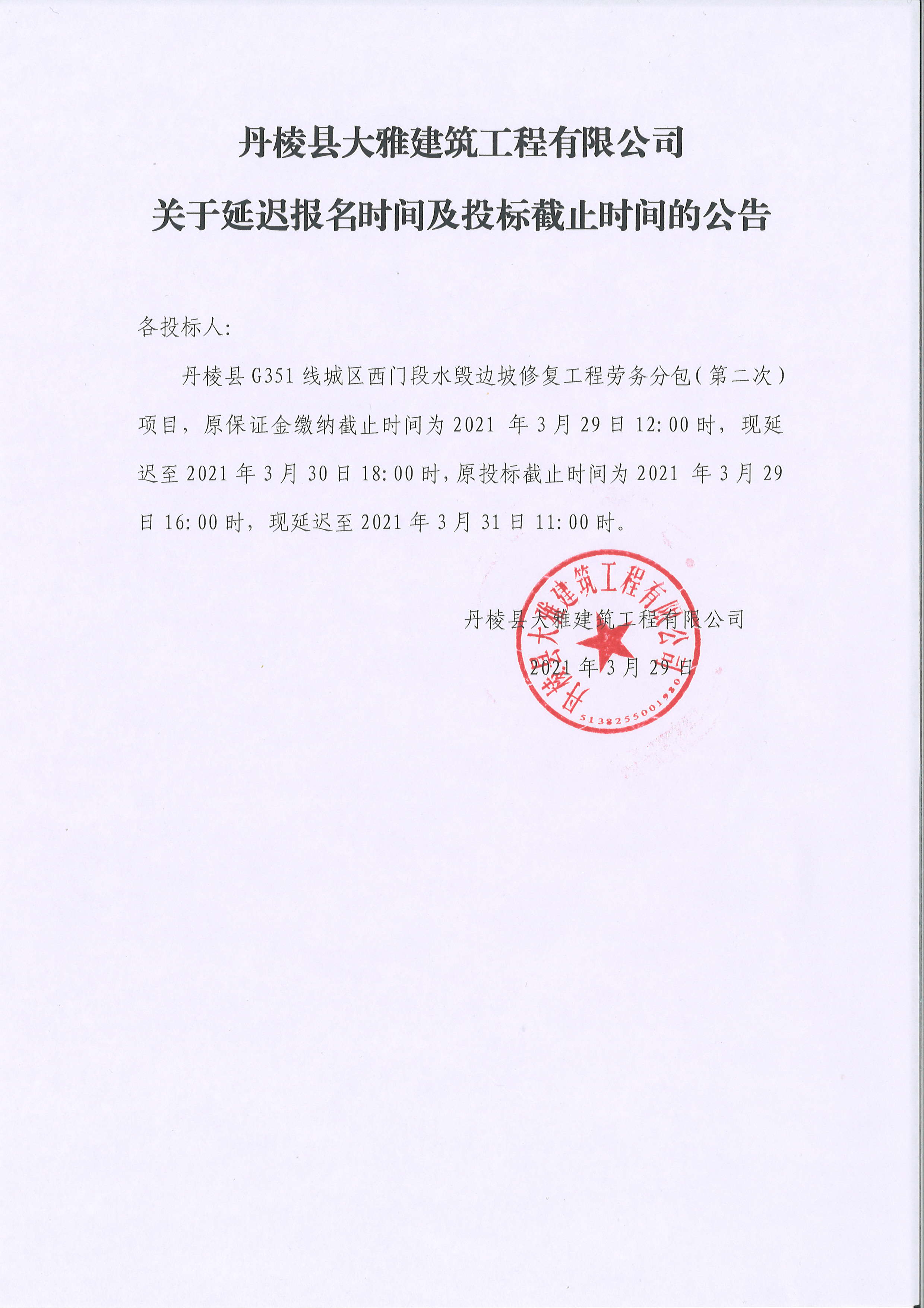 【大雅建筑公司】丹棱縣G351線城區(qū)西門段水毀邊坡修復(fù)工程勞務(wù)分包(第二次)延遲開標時間公告