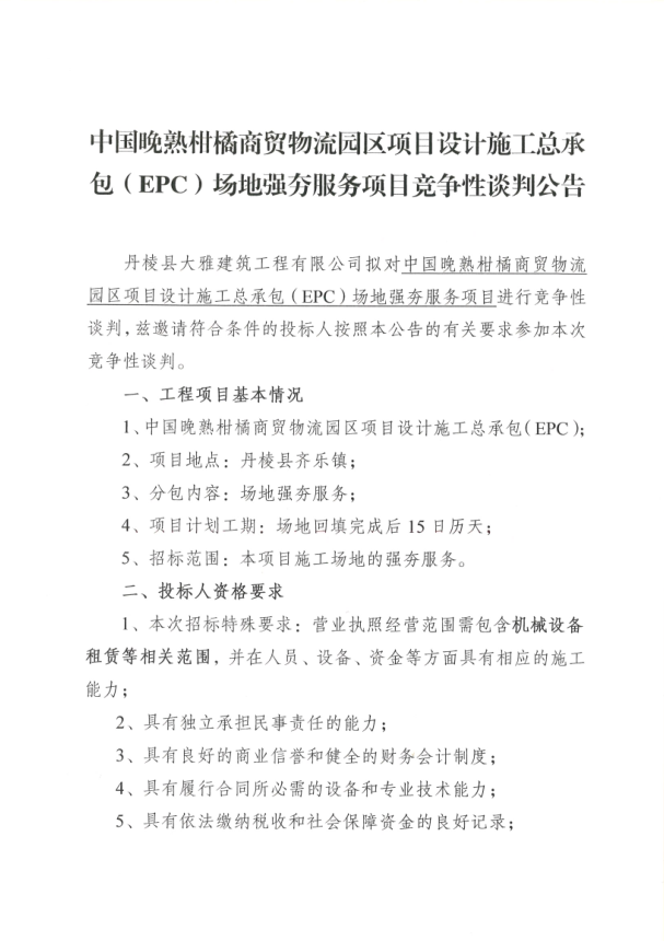 【大雅建筑公司】中國晚熟柑橘商貿(mào)物流園區(qū)項目設計施工總承包(EPC)場地強夯服務項目競爭性談判公告