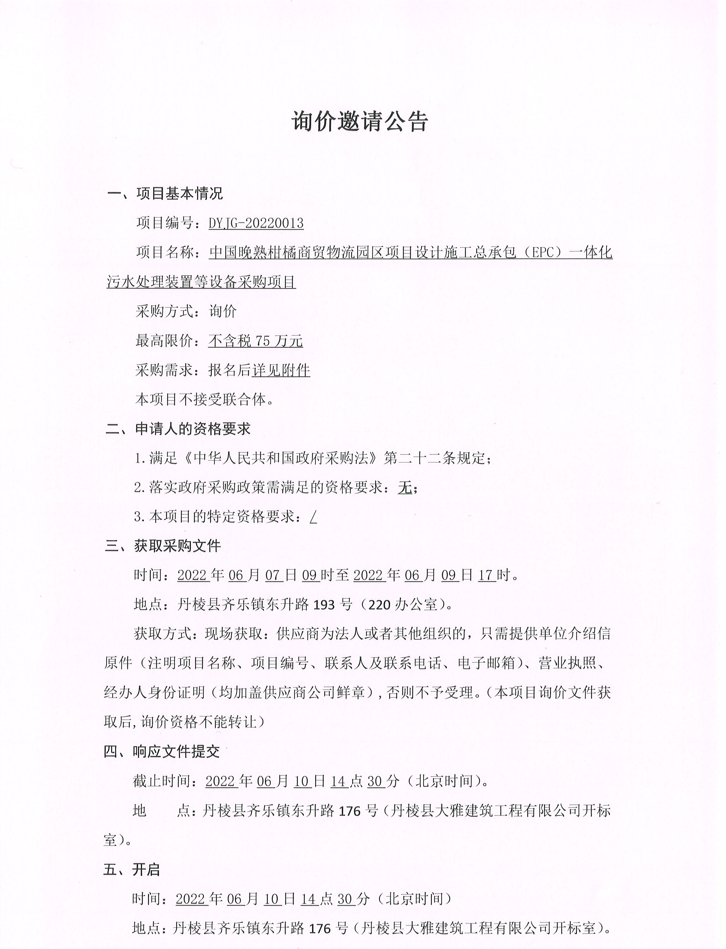 中國晚熟柑橘商貿(mào)物流園區(qū)項(xiàng)目設(shè)計(jì)施工總承包(EPC) 體化污水處理裝置等設(shè)備采購項(xiàng)目詢價(jià)邀請(qǐng)公告