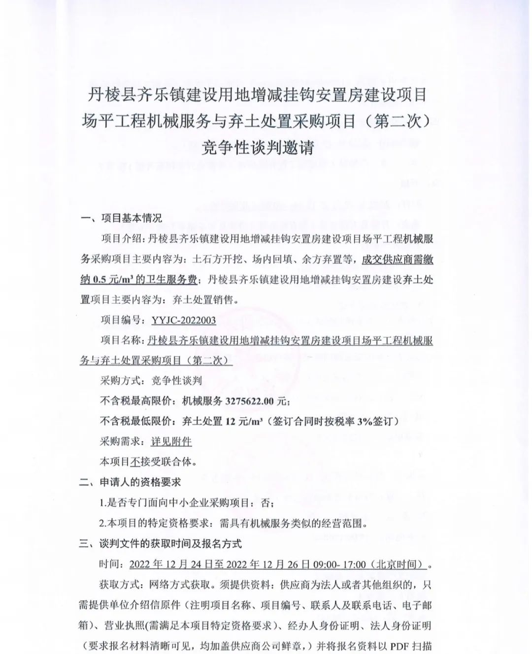 丹棱縣齊樂鎮(zhèn)建設(shè)用地增減掛鉤安置房建設(shè)項目場平工程機械服務與棄土處置采購項目(第二次)競爭性談判邀請