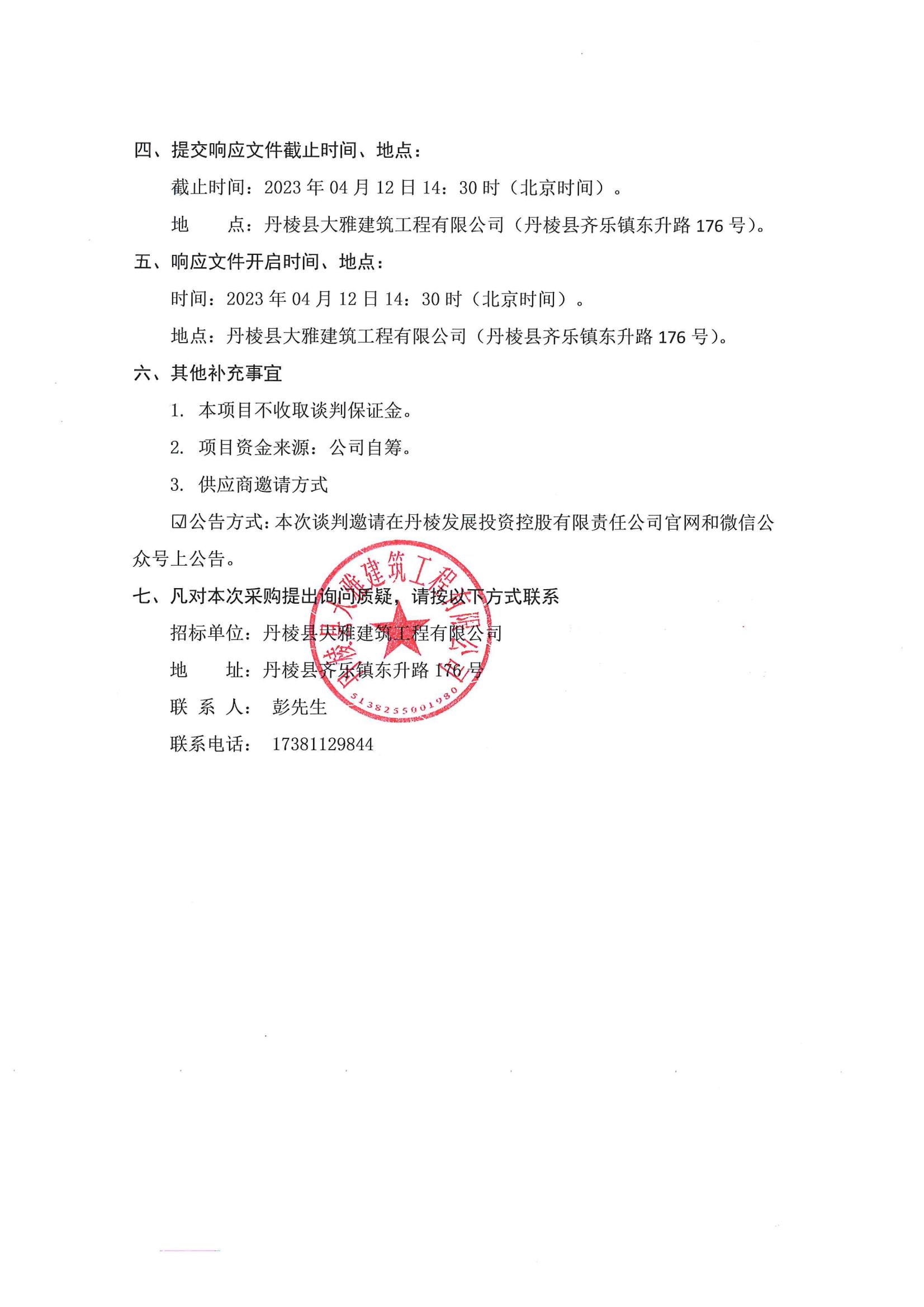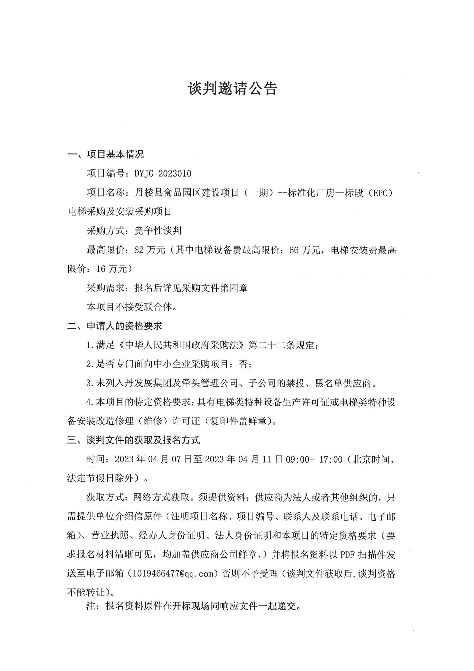 丹棱縣食品園區(qū)建設(shè)項(xiàng)目(一期)--標(biāo)準(zhǔn)化廠房一標(biāo)段(EPC)電梯采購及安裝采購項(xiàng)目談判邀請公告