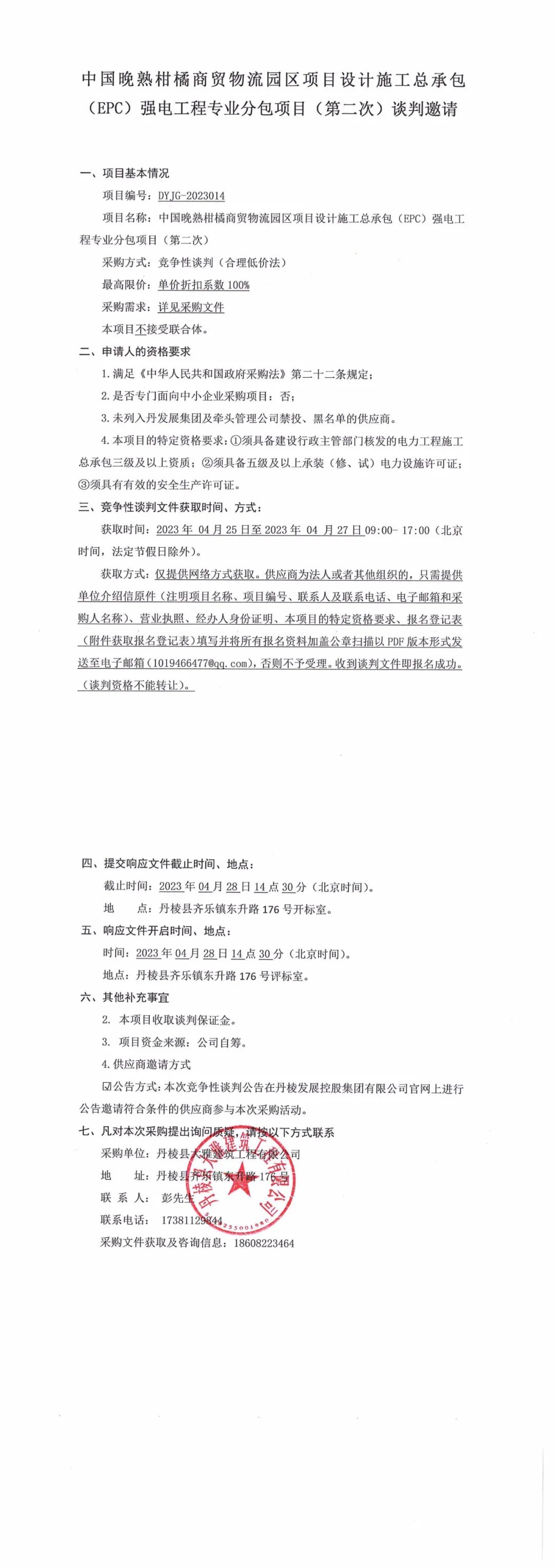 中國晚熟柑橘商貿(mào)物流園區(qū)項(xiàng)目設(shè)計(jì)施工總承包(EPC)強(qiáng)電工程專業(yè)分包項(xiàng)目(第二次)競爭性談判邀請(qǐng)