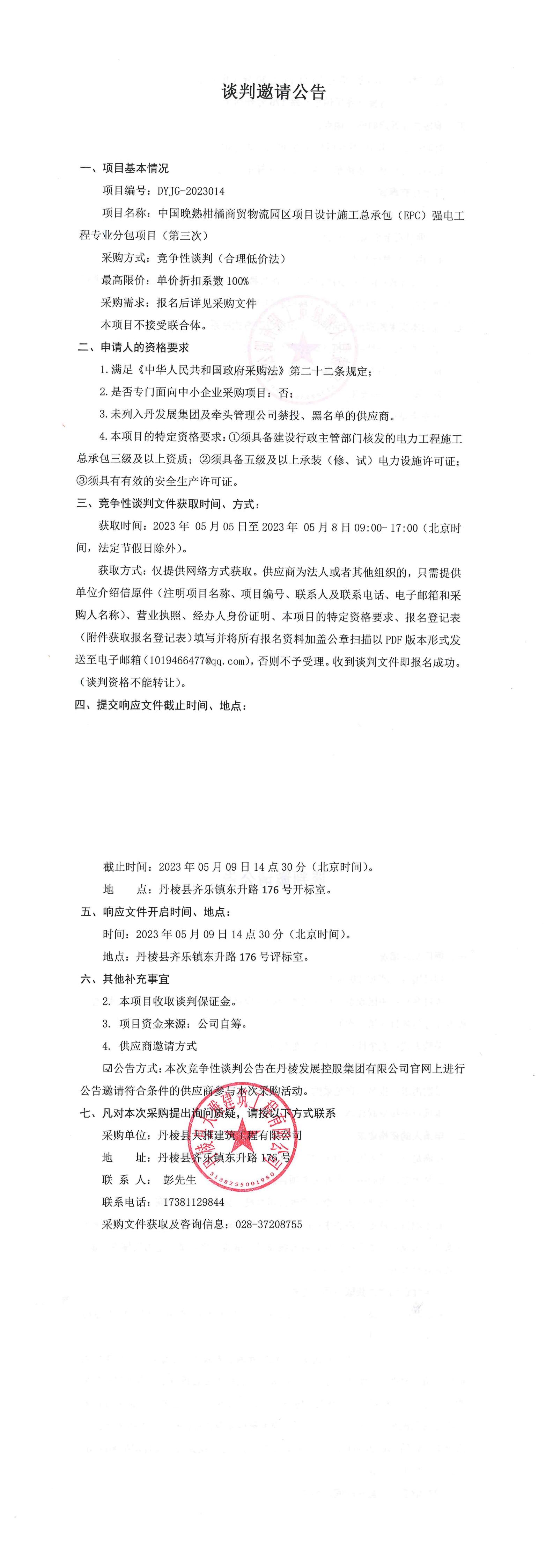 中國晚熟柑橘商貿(mào)物流園區(qū)項目設(shè)計施工總承包(EPC)強電工程專業(yè)分包項目(第三次)談判邀請公告