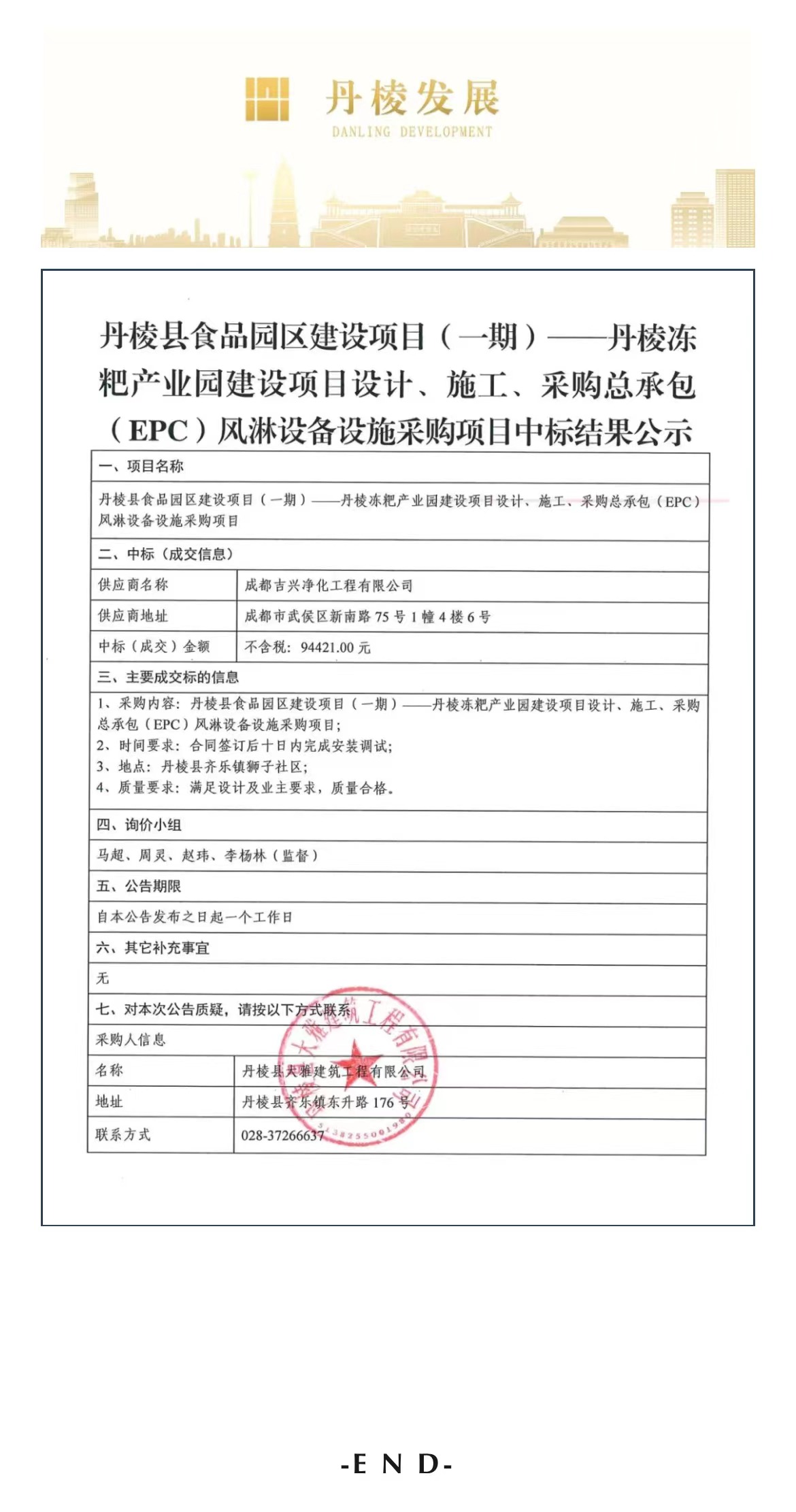 丹棱縣食品園區(qū)建設(shè)項目(一期)—丹棱凍粑產(chǎn)業(yè)園建設(shè)項目設(shè)計、施工、采購總承包(EPC)風(fēng)淋設(shè)備設(shè)施詢價采購項目中標結(jié)果公示