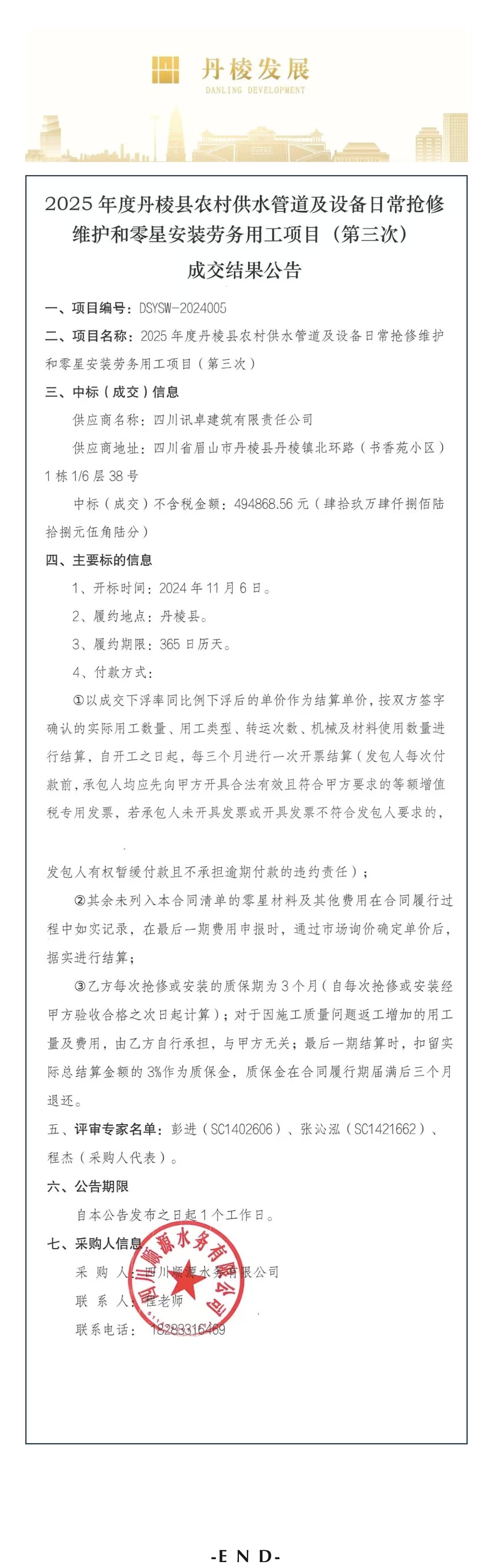 2025年度丹棱縣農(nóng)村供水管道及設(shè)備日常搶修維護(hù)和零星安裝勞務(wù)用工項目(第三次)成交結(jié)果公告