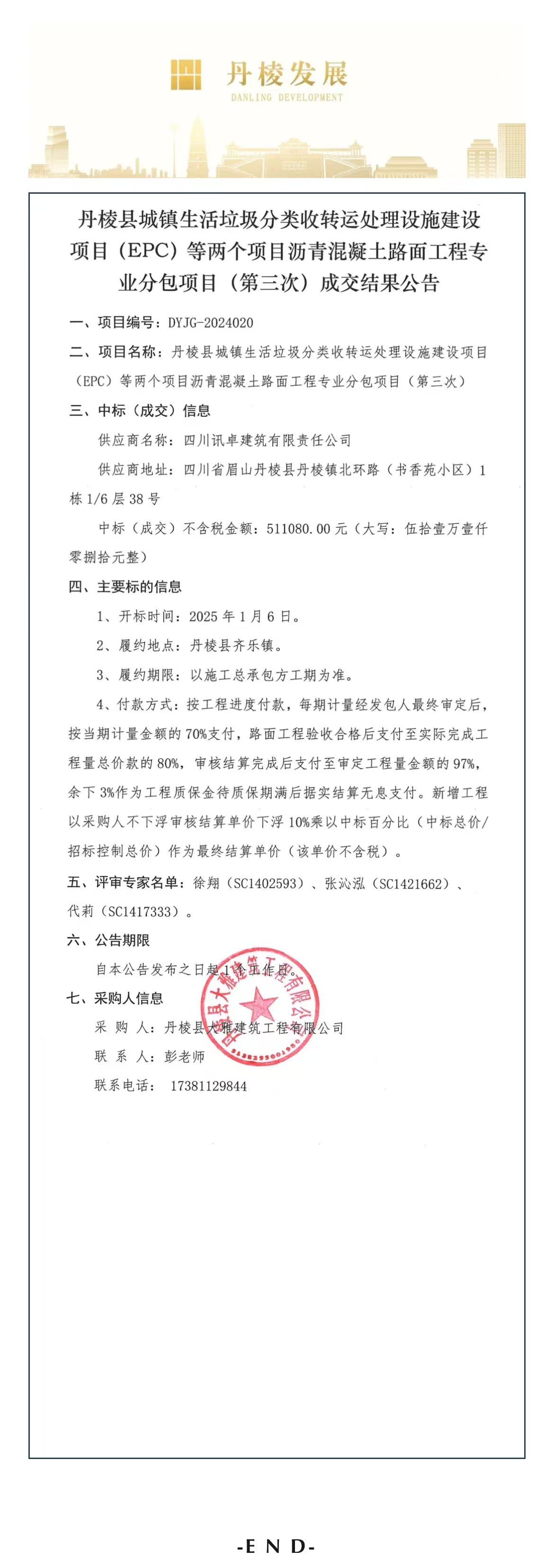 丹棱縣城鎮(zhèn)生活垃圾分類收轉(zhuǎn)運處理設施建設項目(EPC)等兩個項目瀝青混凝土路面工程專業(yè)分包項目(第三次)成交結(jié)果公告