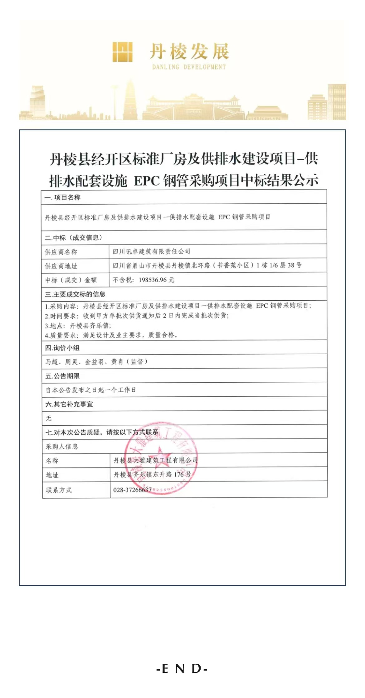 丹棱縣經(jīng)開區(qū)標(biāo)準(zhǔn)廠房及供排水建設(shè)項目——供排水配套設(shè)施EPC鋼管采購項目中標(biāo)結(jié)果公示