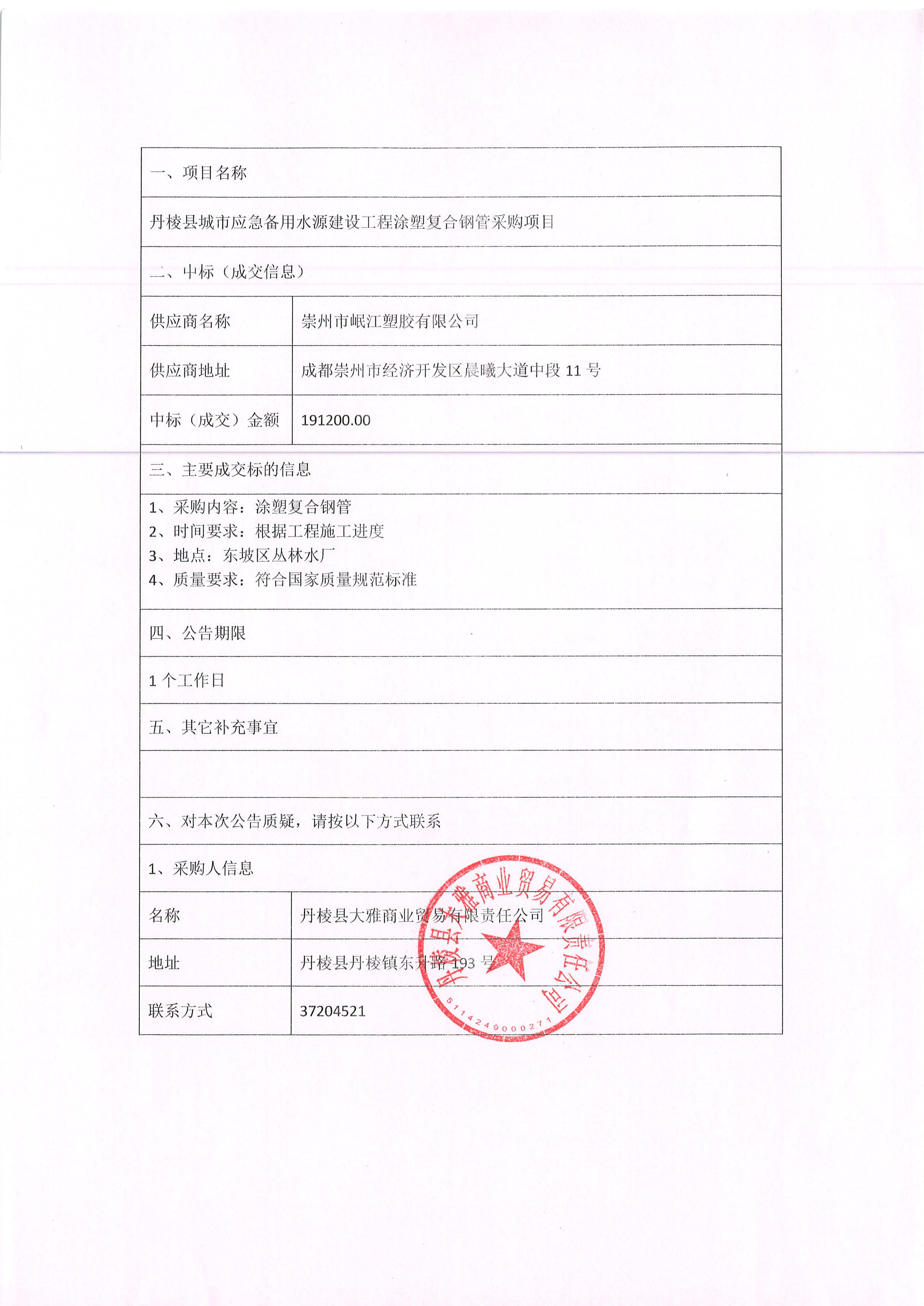 【大雅商貿(mào)公司】丹棱縣城市應(yīng)急備用水源建設(shè)工程涂塑復(fù)合鋼管采購(gòu)項(xiàng)目中標(biāo)結(jié)果公示