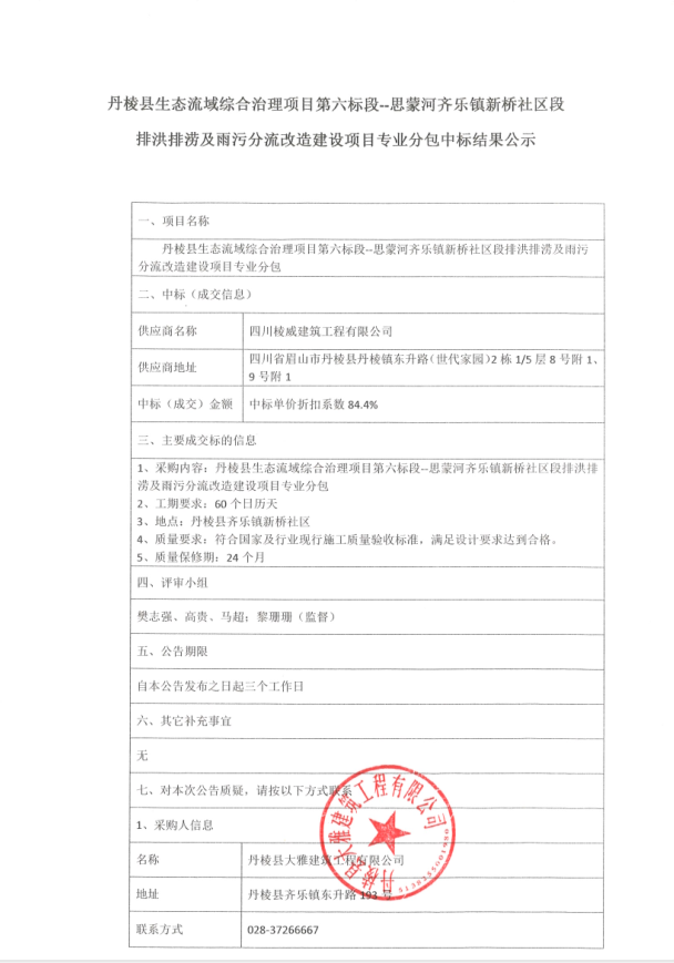 【大雅建筑公司】丹棱縣生態(tài)流域綜合治理項(xiàng)目第六標(biāo)段—思蒙河齊樂(lè)鎮(zhèn)新橋社區(qū)段排洪排澇及雨污分流改造建設(shè)項(xiàng)目專(zhuān)業(yè)分包中標(biāo)結(jié)果公示