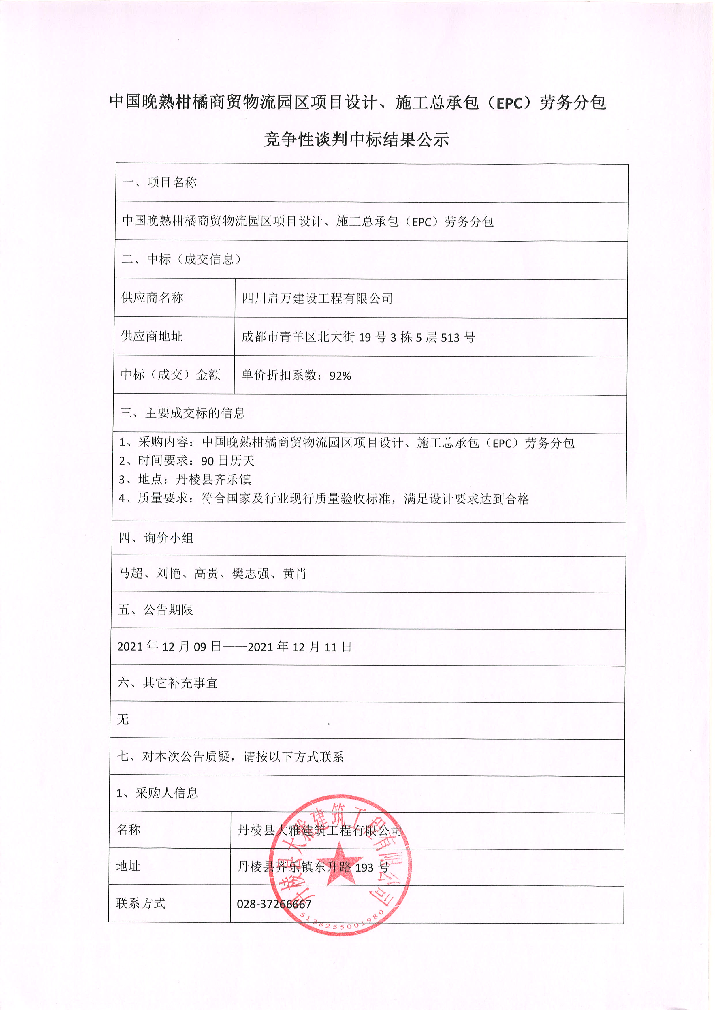 【大雅建筑公司】中國(guó)晚熟柑橘商貿(mào)物流園區(qū)項(xiàng)目設(shè)計(jì)、施工總承包(EPC)勞務(wù)分包競(jìng)爭(zhēng)性談判中標(biāo)結(jié)果公示