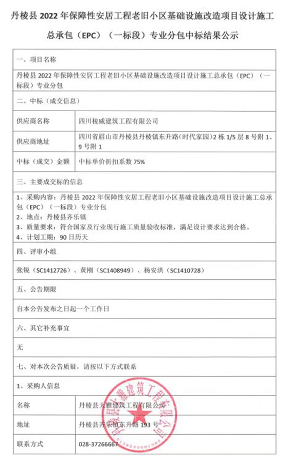 丹棱縣2022年保障性安居工程老舊小區(qū)基礎設施改造項目設計施工總承包(EPC)(一標段)專業(yè)分包中標結果公示