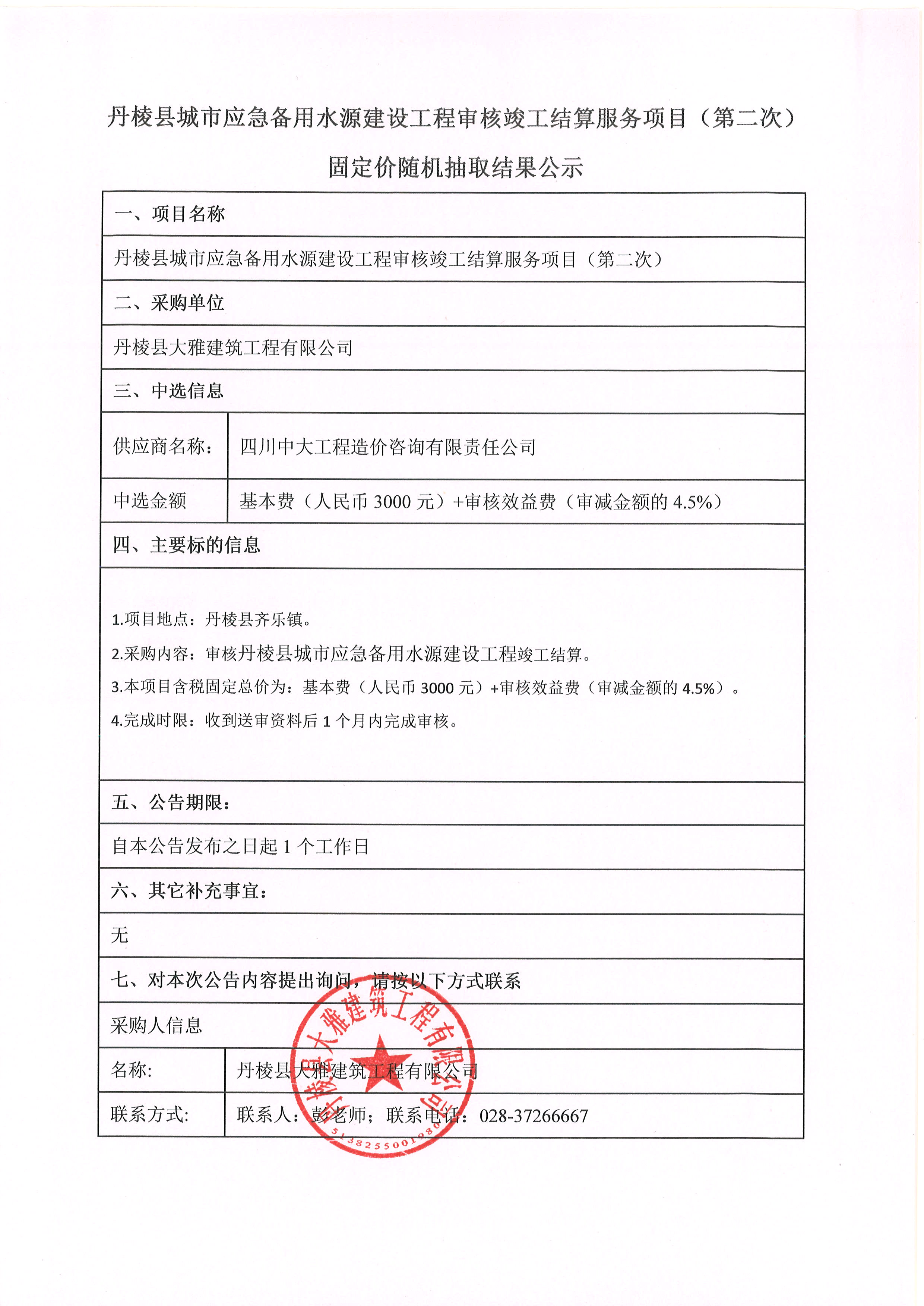 丹棱縣城市應(yīng)急備用水源建設(shè)工程審核竣工結(jié)算服務(wù)項目(第二次) 固定價隨機抽取結(jié)果公示
