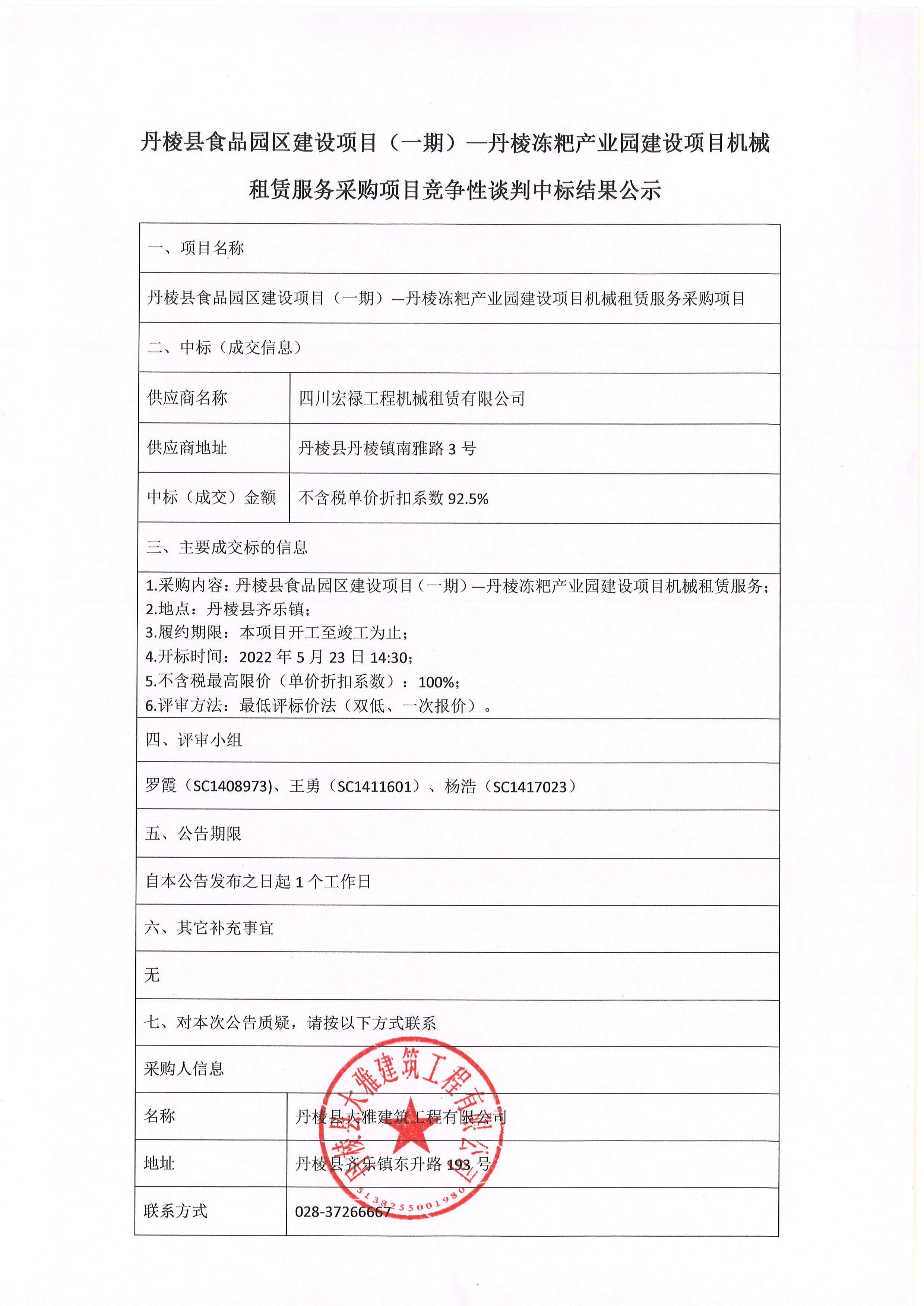 丹棱縣食品園區(qū)建設(shè)項目(一期)-丹棱凍粑產(chǎn)業(yè)園建設(shè)項目機械 租賃服務采購項目競爭性談判中標結(jié)果公示