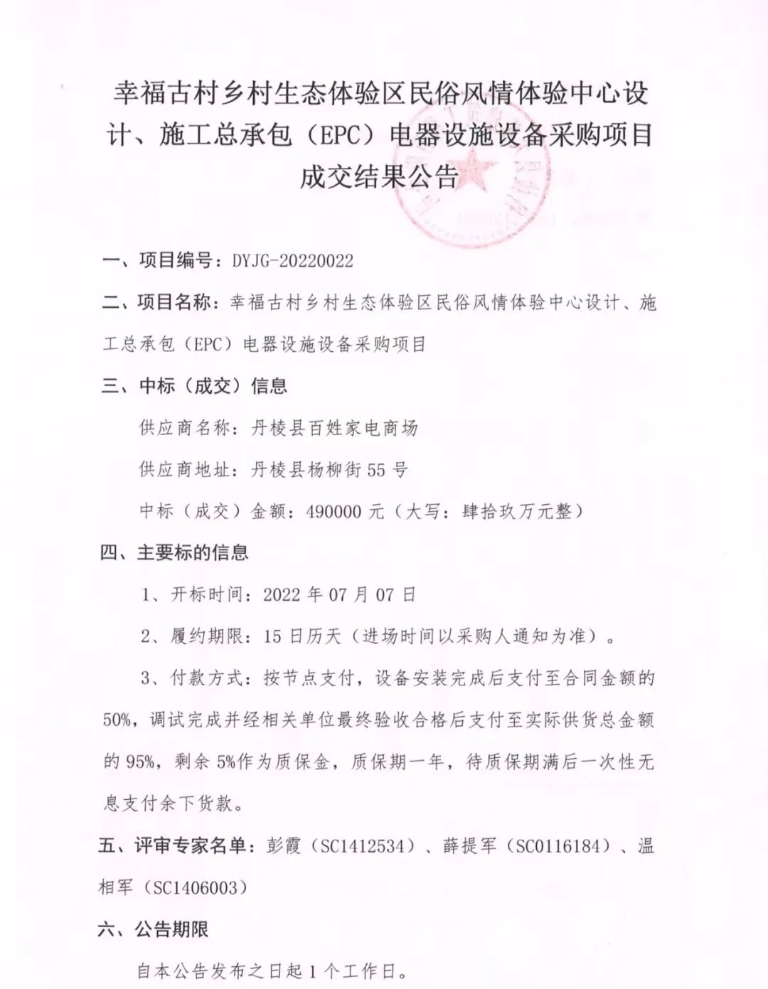 幸福古村鄉(xiāng)村生態(tài)體驗區(qū)民俗風情體驗中心設(shè)計、施工總承包(EPC)電器設(shè)施設(shè)備采購項目成交結(jié)果公告