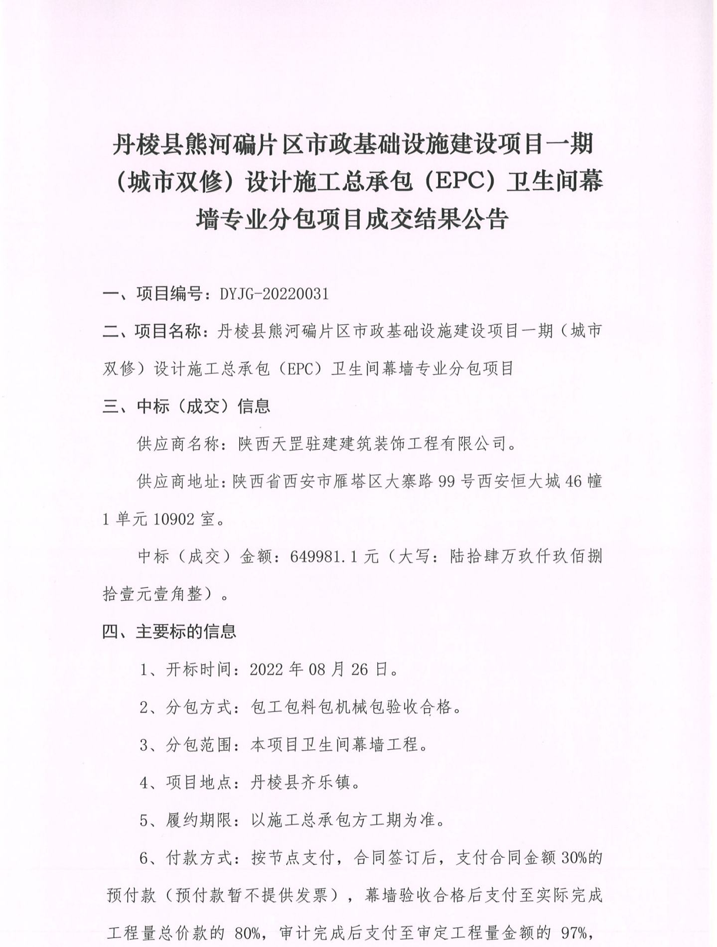 丹棱縣熊河碥片區(qū)市政基礎(chǔ)設(shè)施建設(shè)項(xiàng)目一期(城市雙修)設(shè)計(jì)施工總承包(EPC)衛(wèi)生間幕墻專業(yè)分包項(xiàng)目成交結(jié)果公告