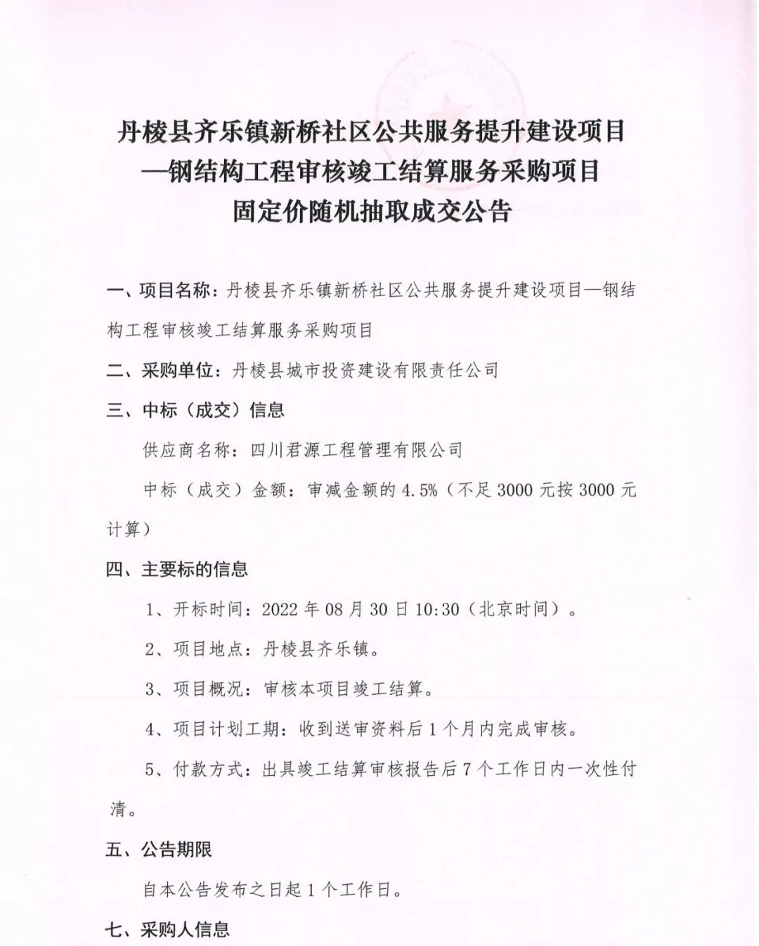 丹棱縣齊樂(lè)鎮(zhèn)新橋社區(qū)公共服務(wù)提升建設(shè)項(xiàng)目--鋼結(jié)構(gòu)工程審核竣工結(jié)算服務(wù)采購(gòu)項(xiàng)目固定價(jià)隨機(jī)抽取成交公告