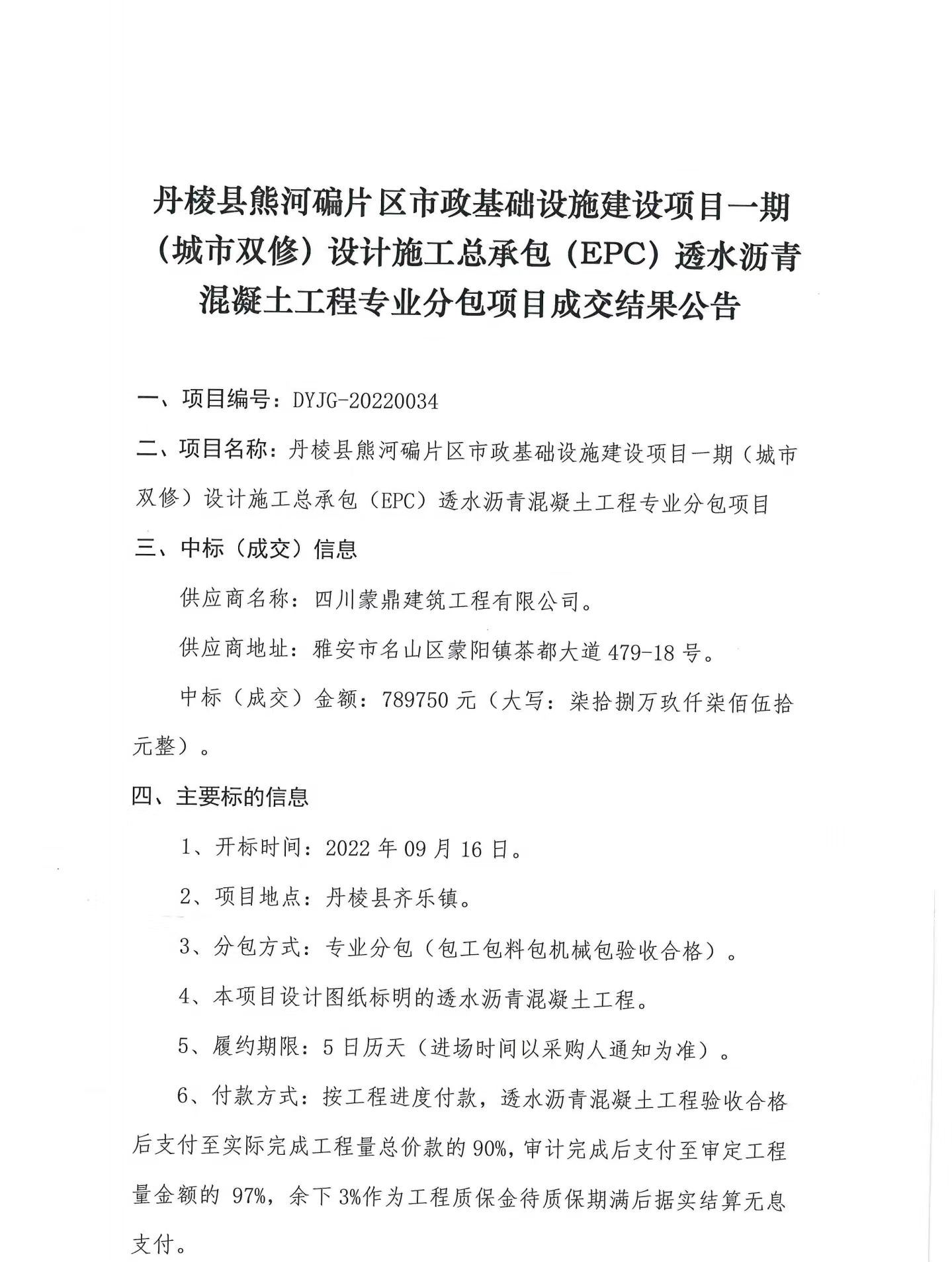 丹棱縣熊河碥片區(qū)市政基礎(chǔ)設(shè)施建設(shè)項(xiàng)目一期(城市雙修)設(shè)計(jì)施工總承包(EPC)透水瀝青混凝土工程專(zhuān)業(yè)分包項(xiàng)目成交結(jié)果公告