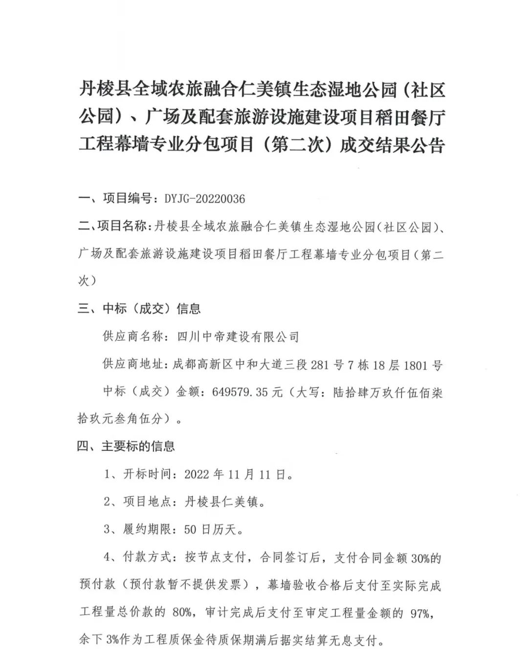 丹棱縣全域農(nóng)旅融合仁美鎮(zhèn)生態(tài)濕地公園(社區(qū)公園)、廣場及配套旅游設(shè)施建設(shè)項目稻田餐廳工程幕墻專業(yè)分包(第二次)成交結(jié)果公告