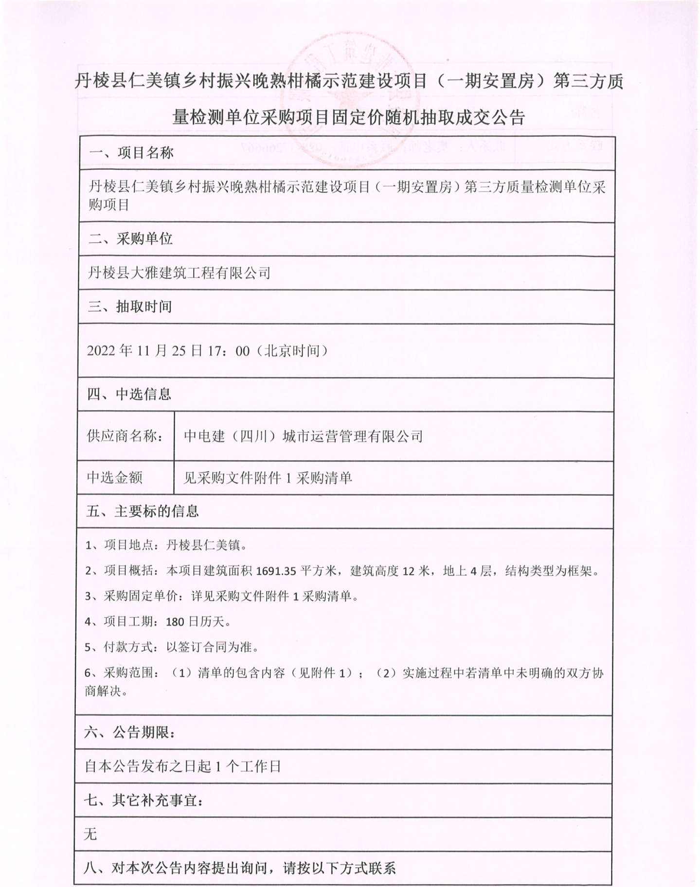 丹棱縣仁美鎮(zhèn)鄉(xiāng)村振興晚熟柑橘示范建設(shè)項(xiàng)目(一期安置房) 第三方質(zhì)量檢測(cè)單位采購(gòu)項(xiàng)目固定價(jià)隨機(jī)抽取成交公告
