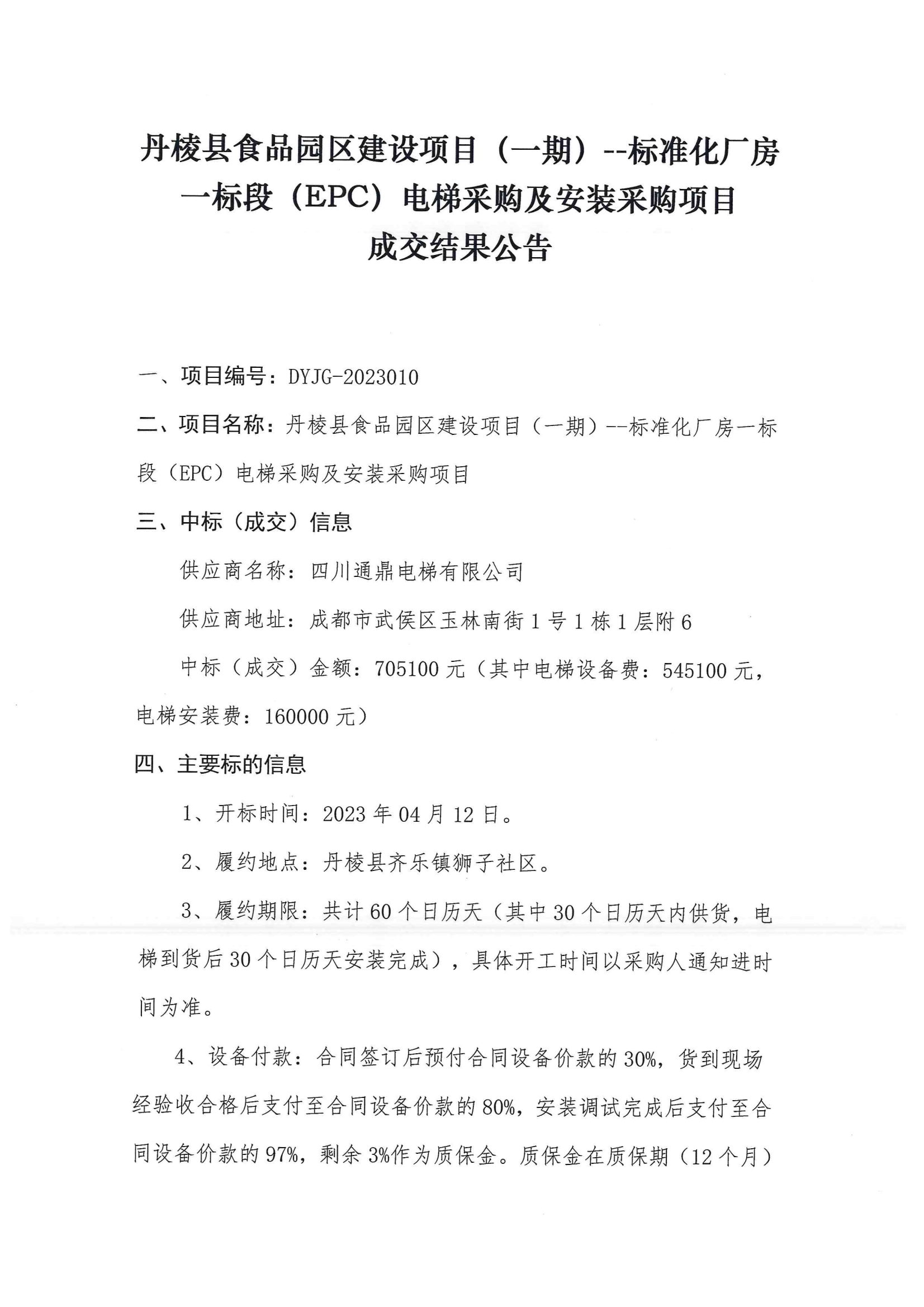 丹棱縣食品園區(qū)建設(shè)項(xiàng)目(一期)--標(biāo)準(zhǔn)化廠房一標(biāo)段(EPC)電梯采購(gòu)及安裝采購(gòu)項(xiàng)目成交結(jié)果公告