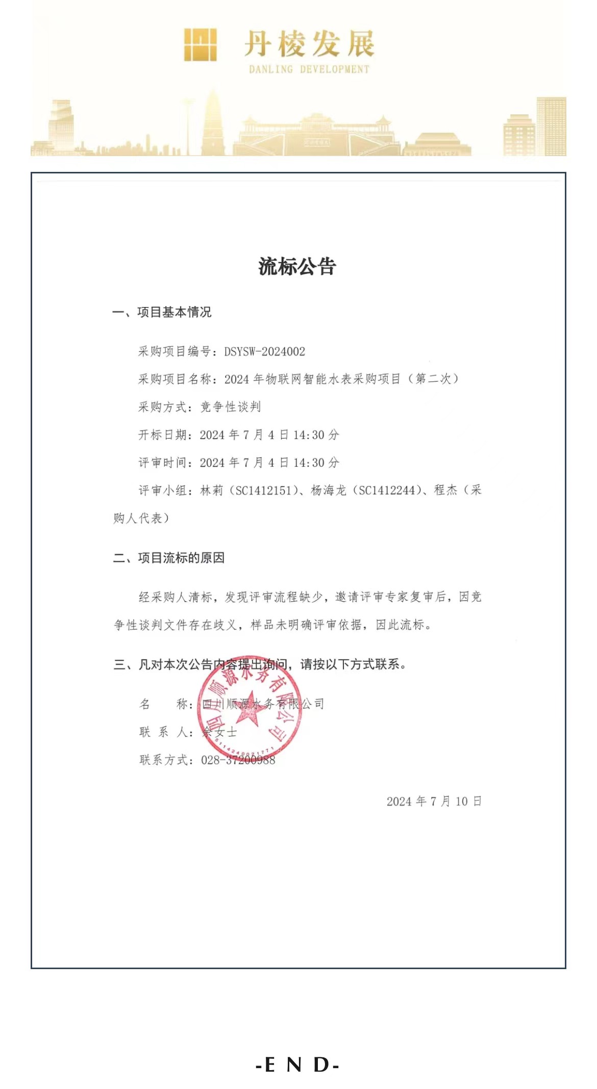 2024年物聯(lián)網(wǎng)智能水表采購(gòu)項(xiàng)目(第二次)流標(biāo)公告