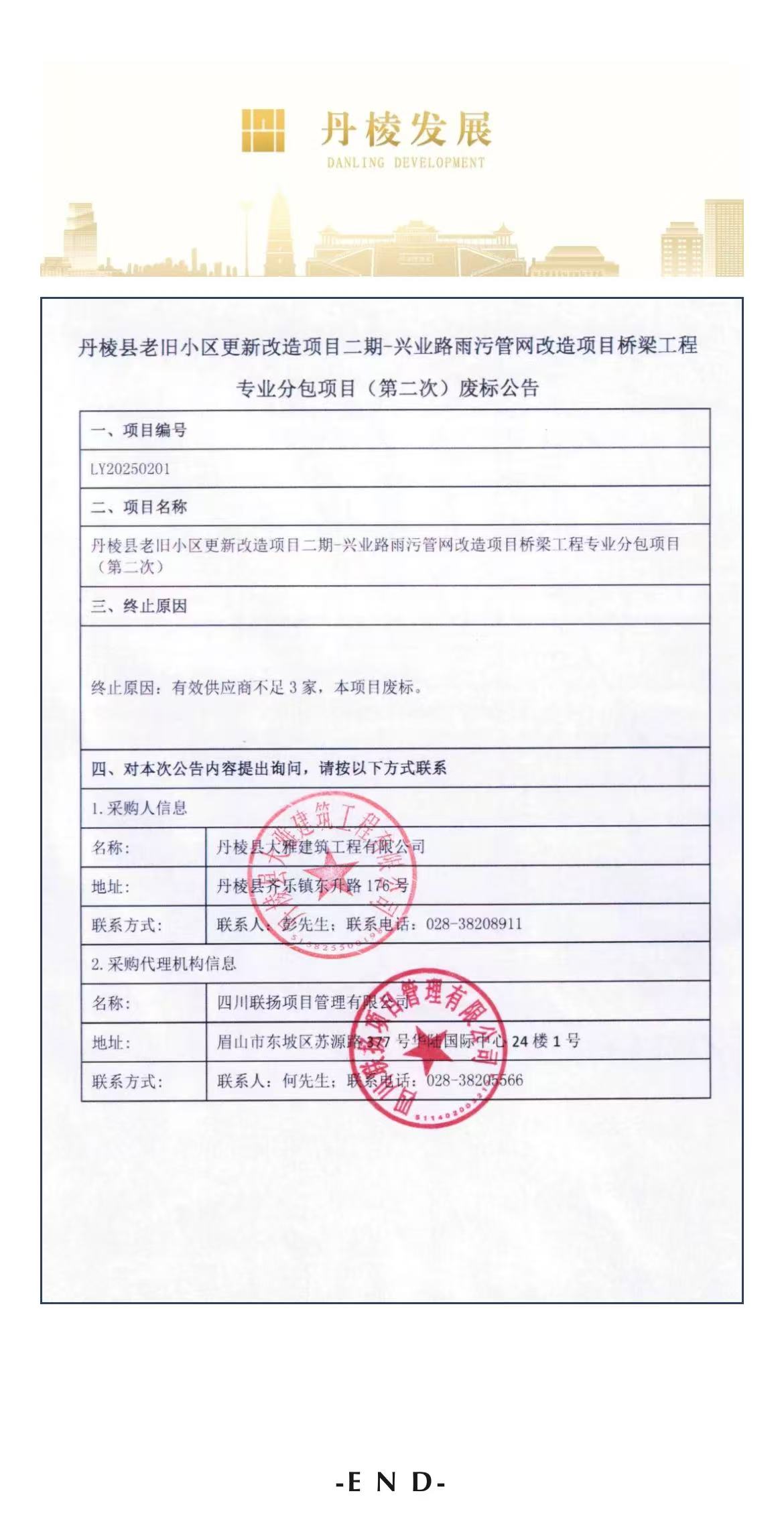丹棱縣老舊小區(qū)更新改造項目二期-興業(yè)路雨污管網(wǎng)改造項目橋梁工程專業(yè)分包項目(第二次)廢標公告