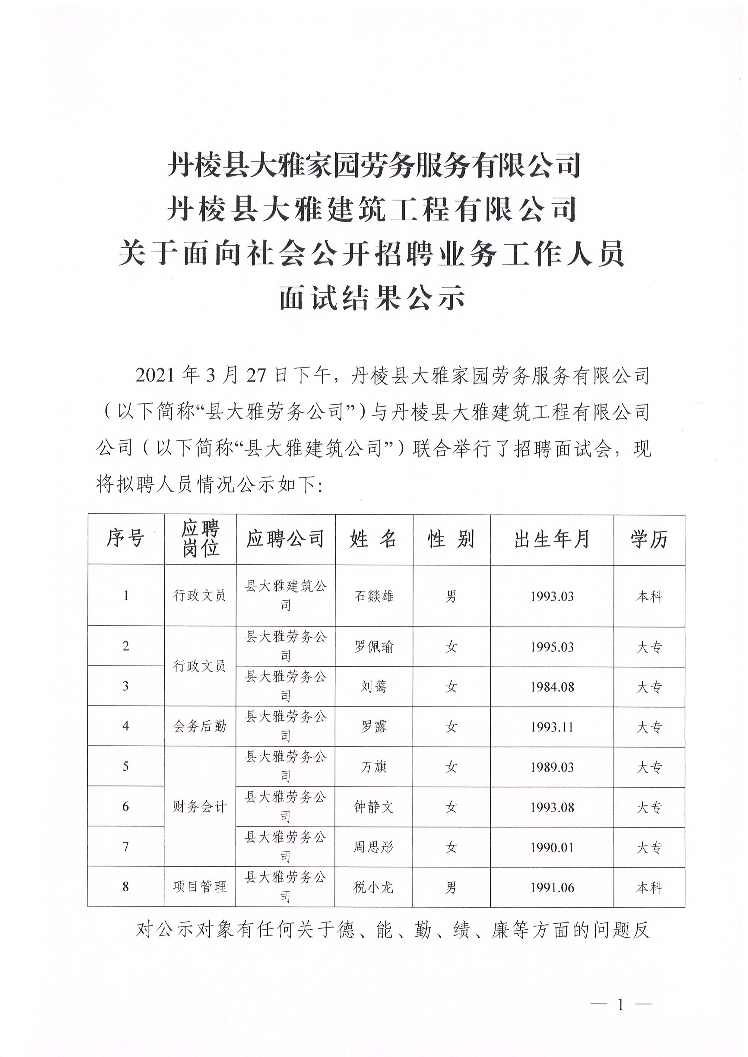 【大雅勞務公司】【大雅建筑公司】關于面向社會公開招聘業(yè)務工作人員 面試結果公示