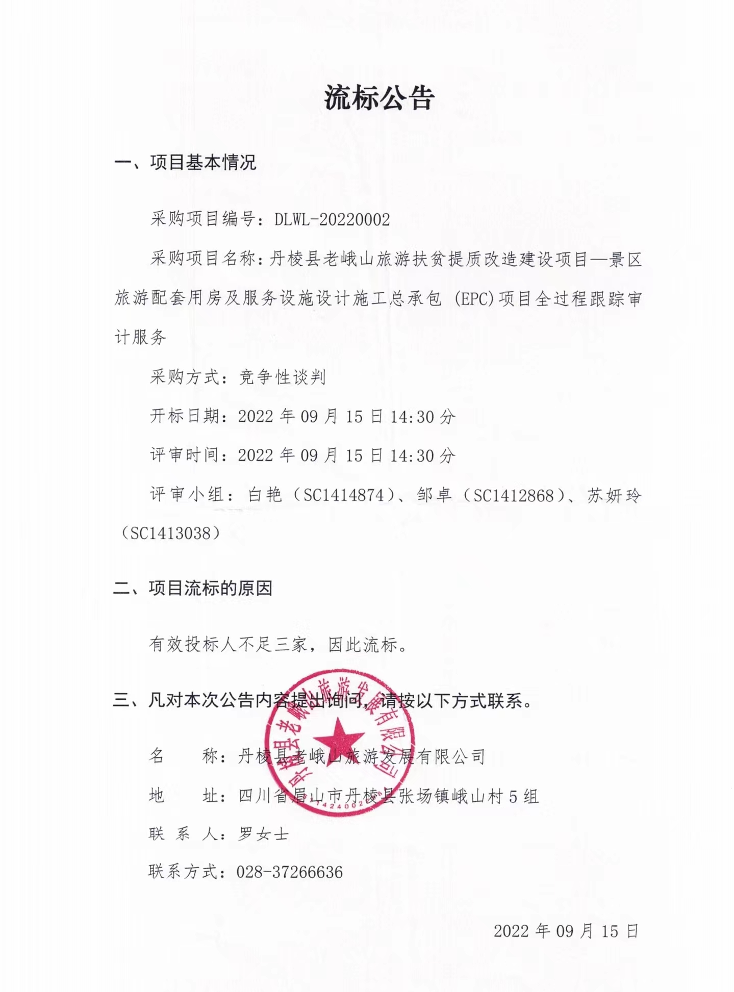 丹棱縣老峨山旅游扶貧提質改造建設項目--景區(qū)旅游配套用房及服務設施設計施工總承包(EPC)項目全過程跟蹤審計服務流標公告