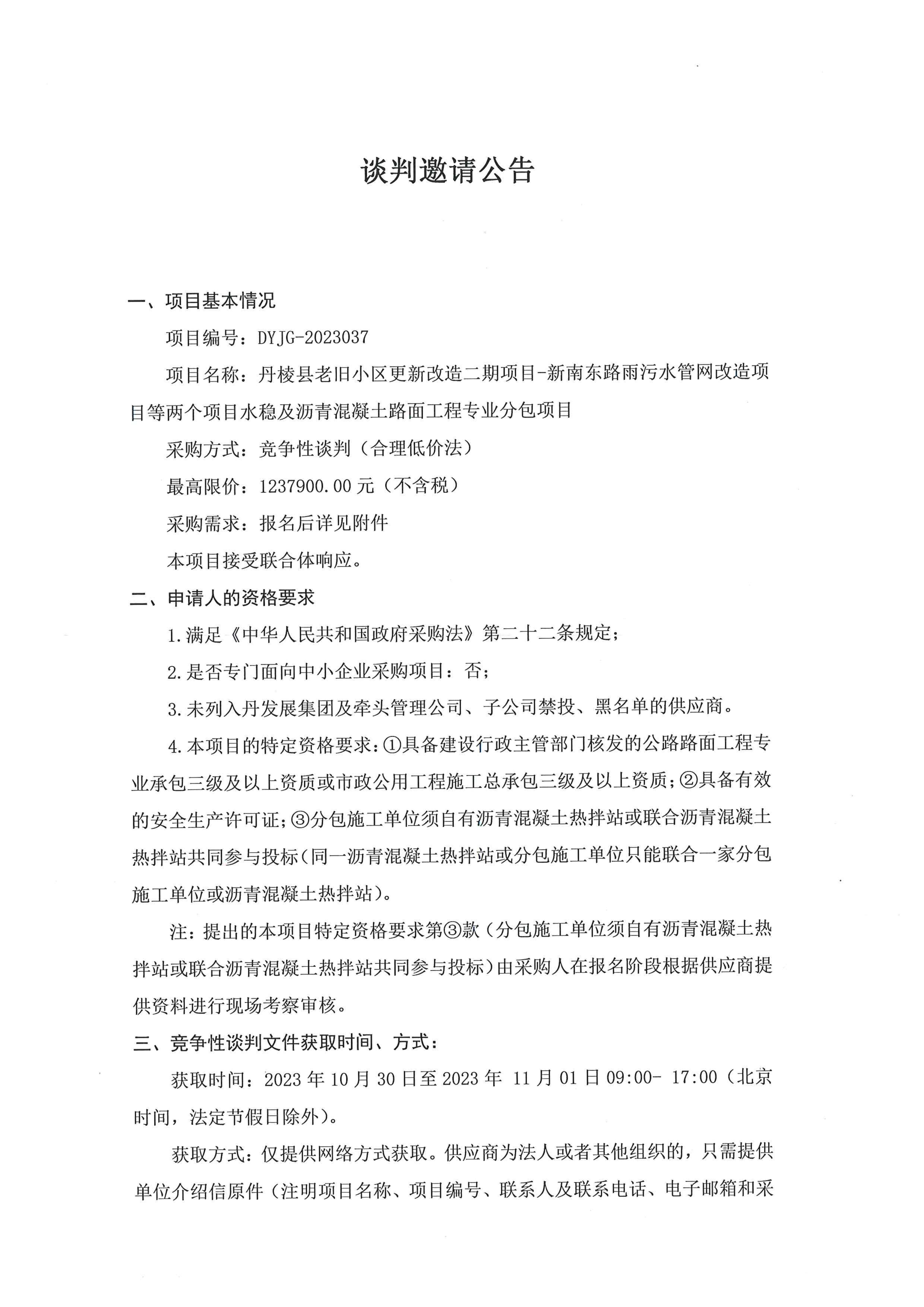 丹棱縣老舊小區(qū)更新改造二期項(xiàng)目-新南東路雨污水管網(wǎng)改造項(xiàng)目等兩個(gè)項(xiàng)目水穩(wěn)及瀝青混凝土路面工程專業(yè)分包項(xiàng)目談判邀請公告