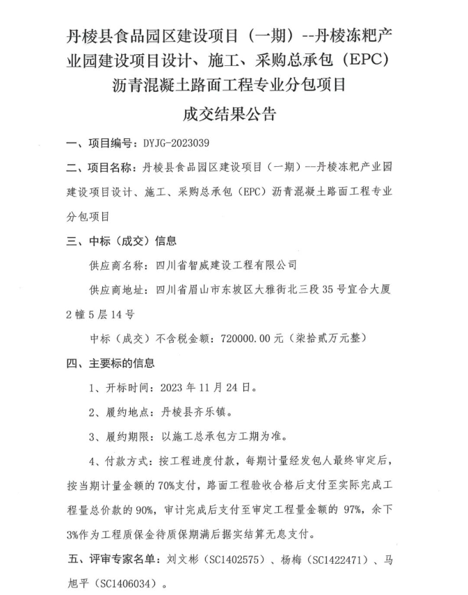 丹棱縣食品園區(qū)建設(shè)項(xiàng)目(一期)—丹棱凍粑產(chǎn)業(yè)園建設(shè)項(xiàng)目設(shè)計(jì)、施工、采購總承包(EPC)瀝青混凝土路面工程專業(yè)分包項(xiàng)目成交結(jié)果公告