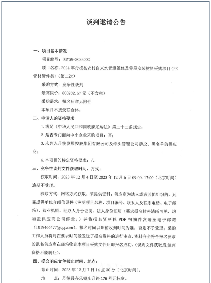 2024年丹棱縣農村自來水管道維修及零星安裝材料采購項目(PE管材管件類)(第二次)談判邀請公告