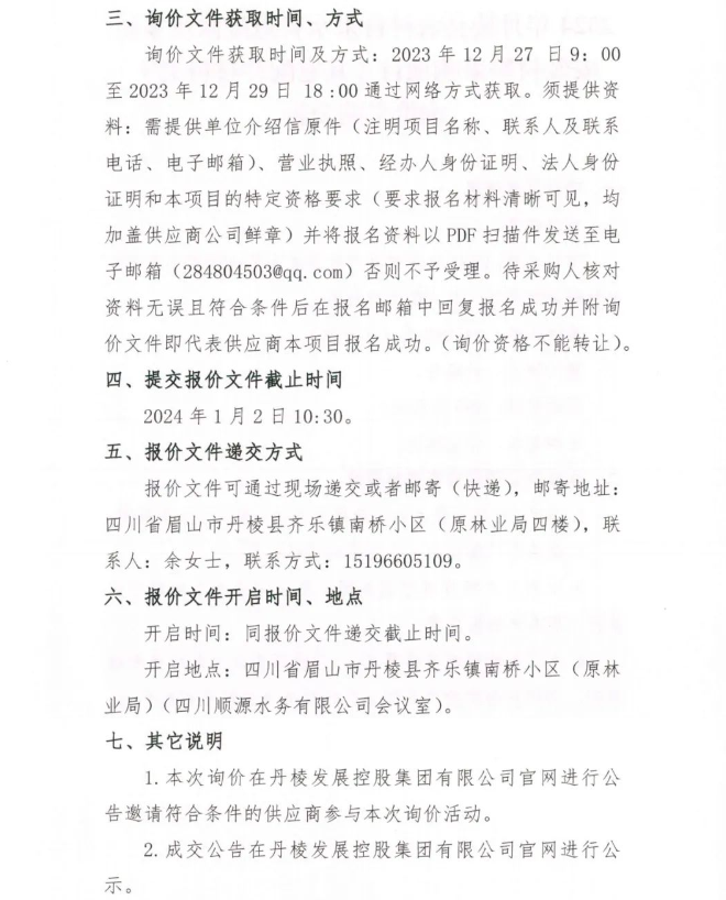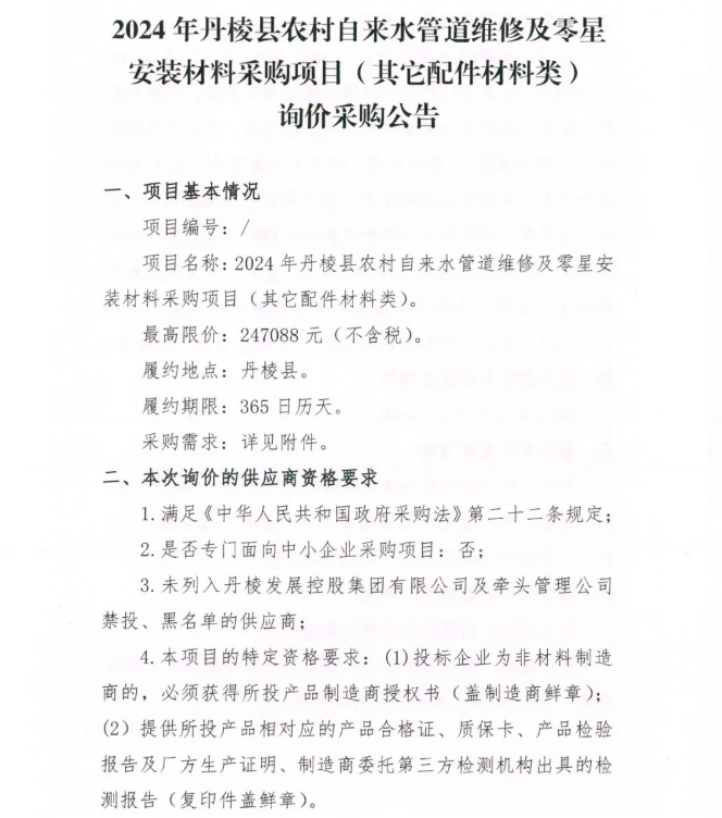2024年丹棱縣農(nóng)村自來水管道維修及零星安裝材料采購項(xiàng)目 (其它配件材料類 )詢價(jià)采購公告