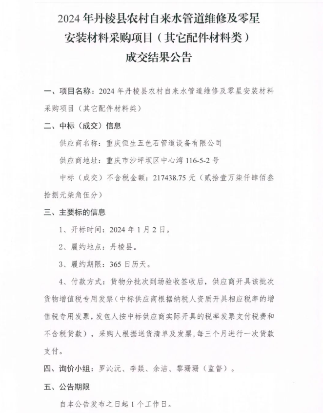 2024年丹棱縣農(nóng)村自來水管道維修及零星安裝材料采購(gòu)項(xiàng)目 (其它配件材料類 )成交結(jié)果公告