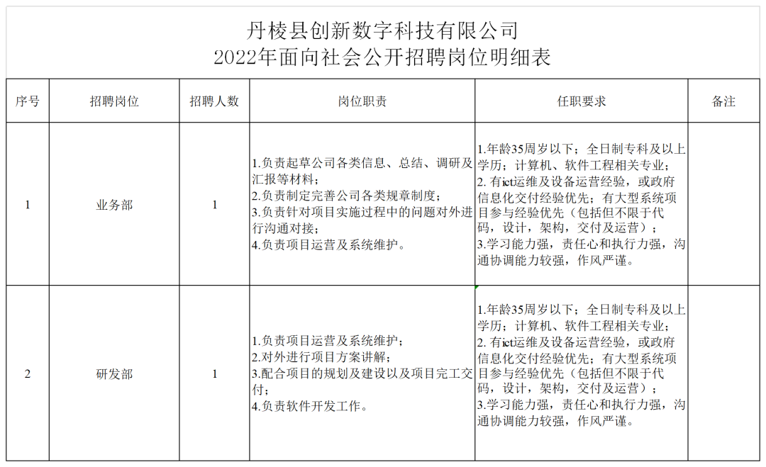 招聘崗位的學歷、專業(yè)、資歷、年齡等資格條件詳見附件《丹棱縣創(chuàng)新數(shù)字科技有限公司2022年面向社會公開招聘崗位明細表》。