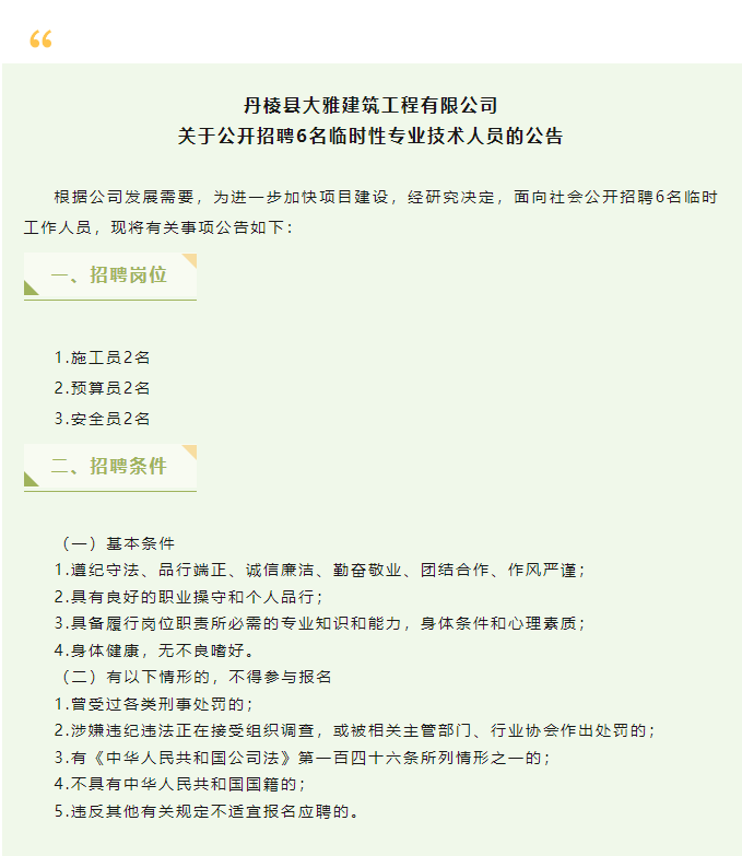 丹棱縣大雅建筑工程有限公司關(guān)于公開招聘6名臨時(shí)性專業(yè)技術(shù)人員的公告