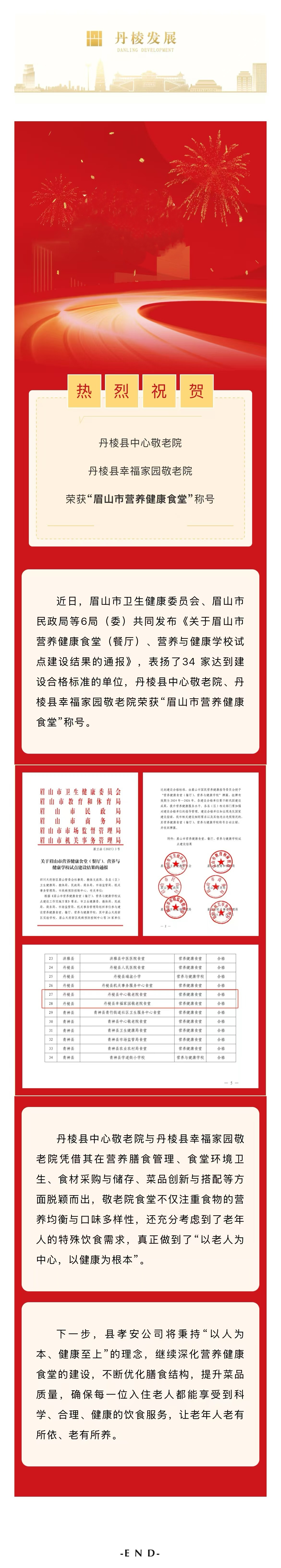 【縣孝安公司】喜報(bào)!丹棱縣中心敬老院、丹棱縣幸福家園敬老院榮獲“眉山市營養(yǎng)健康食堂”稱號(hào)